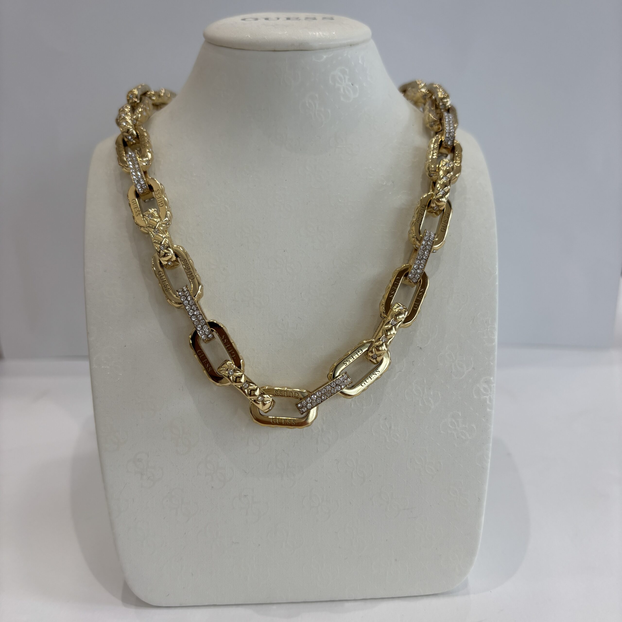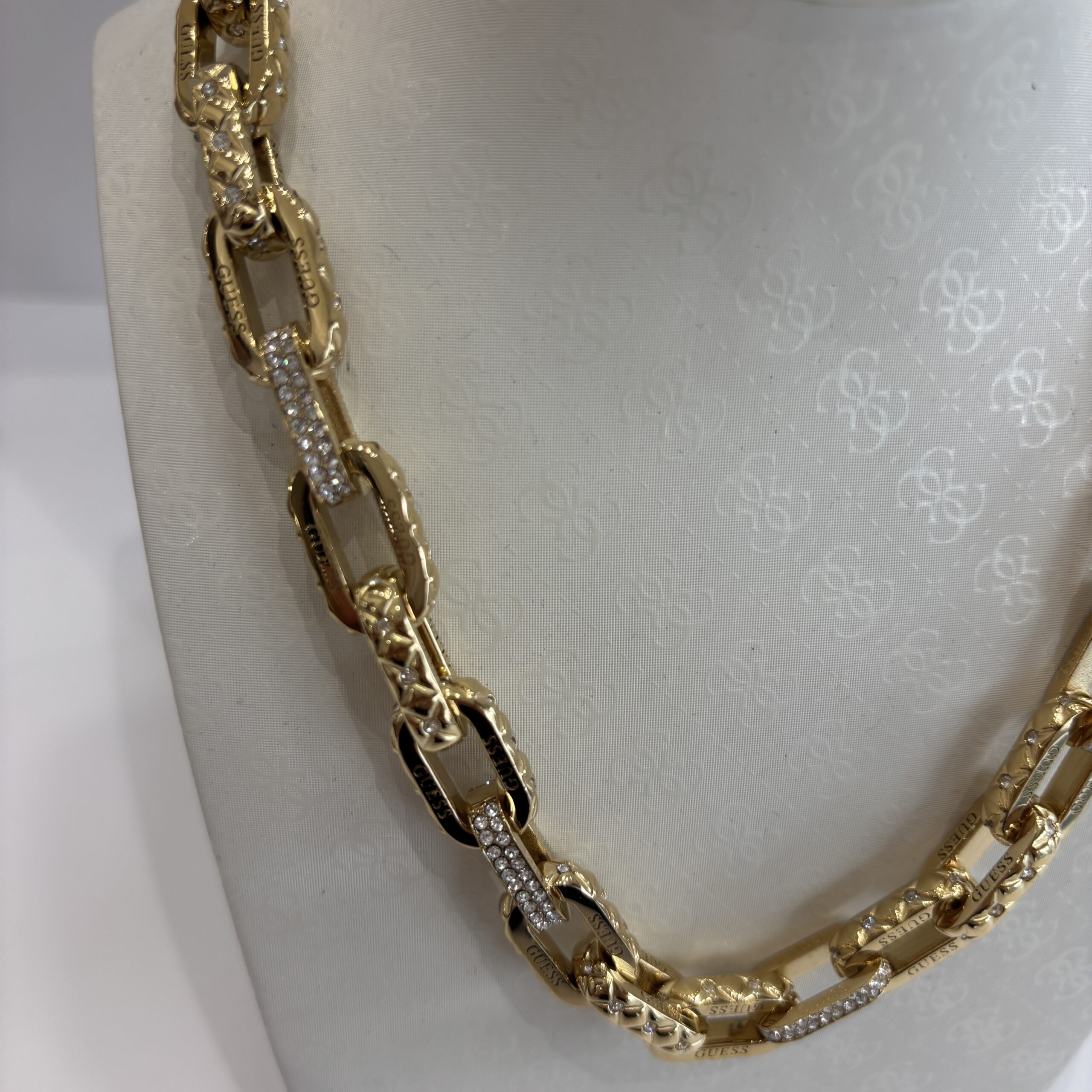 Gargantilha de elos em aço inox dourado com aplicação de cristais.