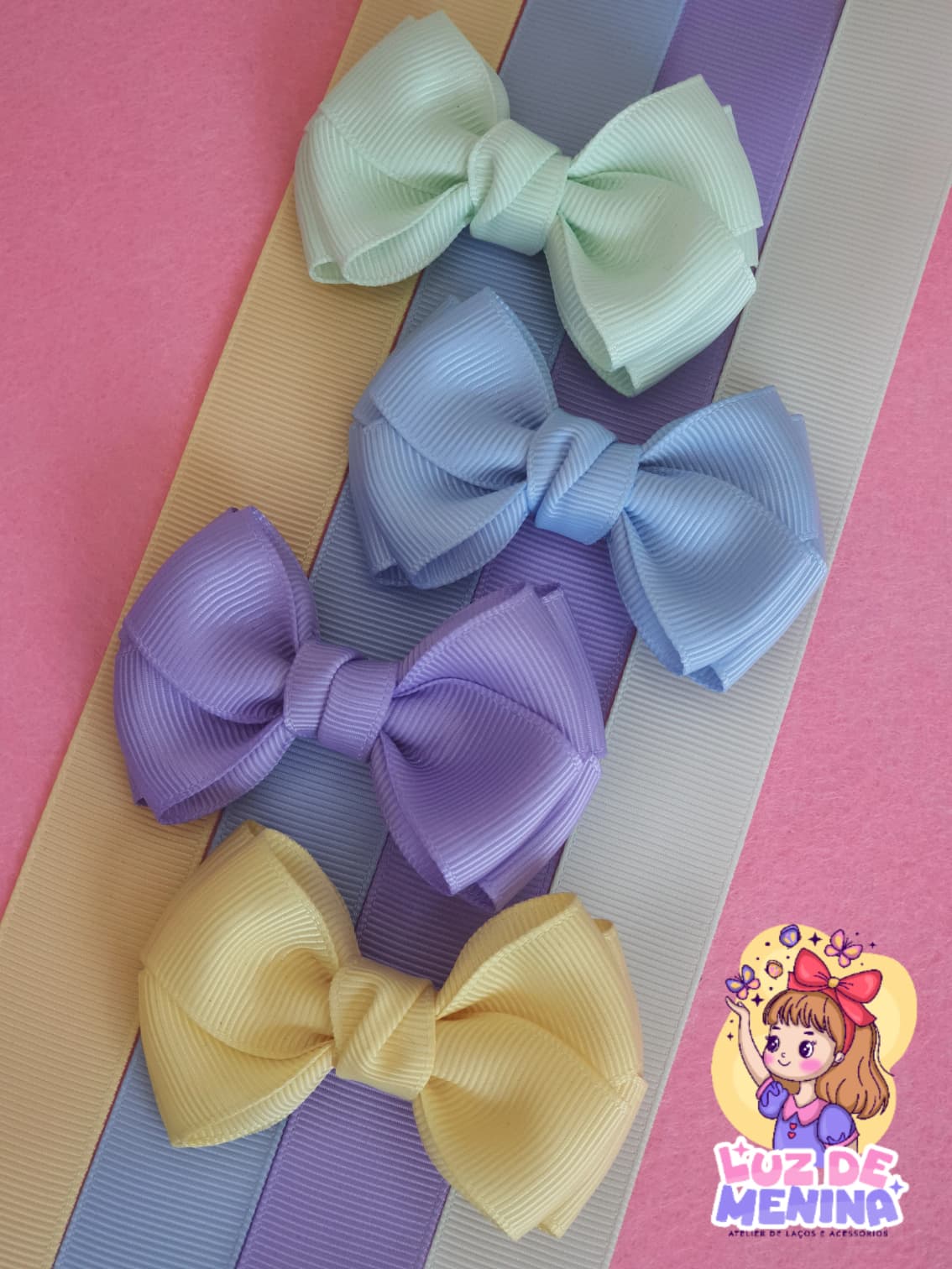 Laço em fita de gorgurão duplo (22 mm)Delicadamente confeccionado com fita de gorgurão de alta qualidade, este laço está disponível em encantadoras cores: * Menta Gelada;* Lilás;* Amarelo Leitelho;* Azul Bebé. 🎀 As cores dos produtos podem apresentar pequenas variações, consoante as definições do ecrã ou dispositivo utilizado. 📏 Tamanho aproximado: 7 cm  Está firmemente aplicado num gancho metálico de 4,5 cm, totalmente revestido com fita de gorgurão para maior conforto e segurança. 🕒 O prazo de...