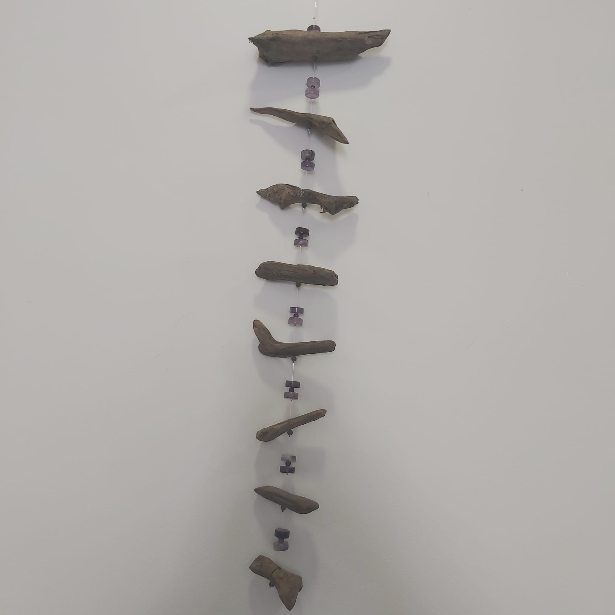 Mobilé de madeira flutuante e pedra ametista