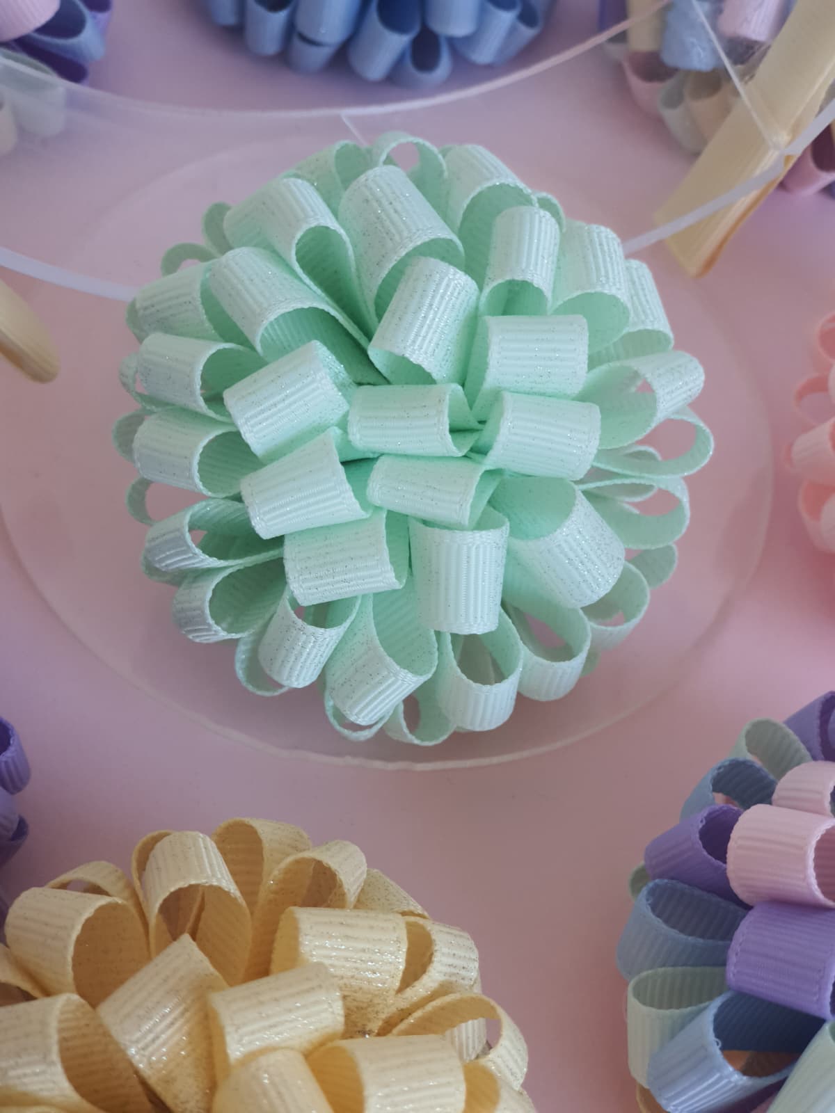 Pompom em fita de gorgurão (10 mm)Delicadamente confeccionado com fita de gorgurão, nas cores suaves e encantadoras: Lilás, Rosa Algodão Doce, Verde Menta Fresca, Amarelo Leitelho e Azul Bebé. 🎀 As cores dos produtos podem apresentar pequenas variações, consoante as definições do ecrã ou dispositivo utilizado. Tamanho: aproximadamente 6 cm de diâmetro. Apresenta um acabamento cuidado em feltro e está firmemente aplicado num gancho metálico de 4,5 cm, totalmente revestido com fita de gorgurão para...